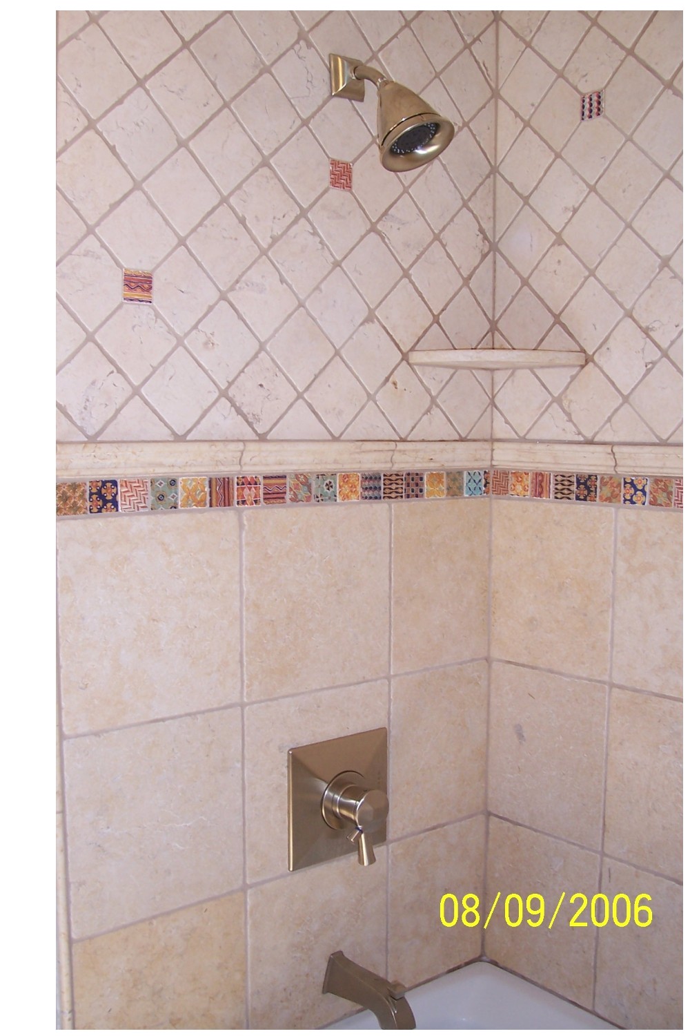 The large wall tiles accompanied by the border and diagonal tumbled marble really adds depth and prestige to the typical tub surround