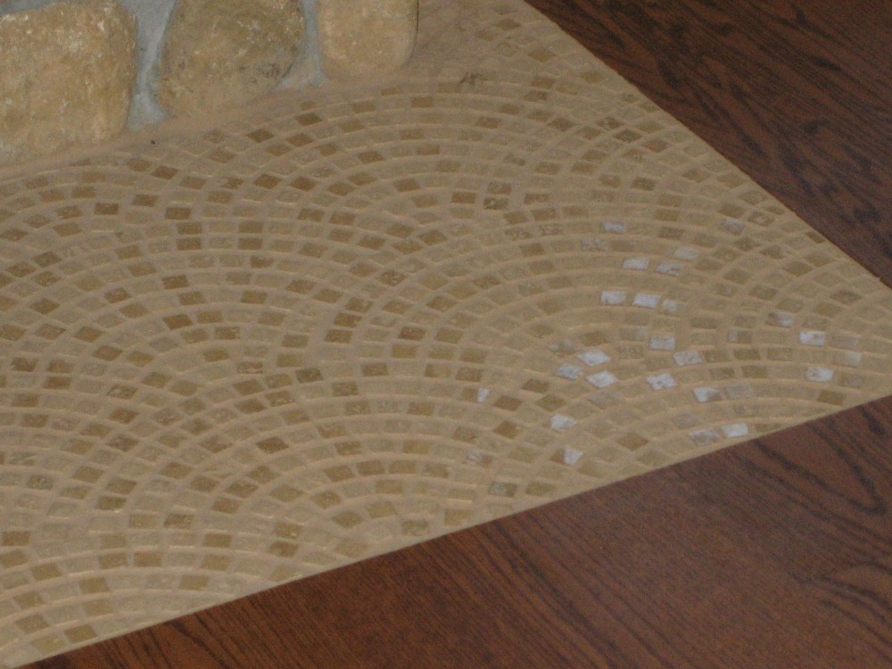 The tumbled marble "fan" installation at the fireplace hearth simulates a swirling motion