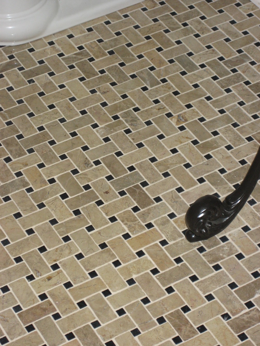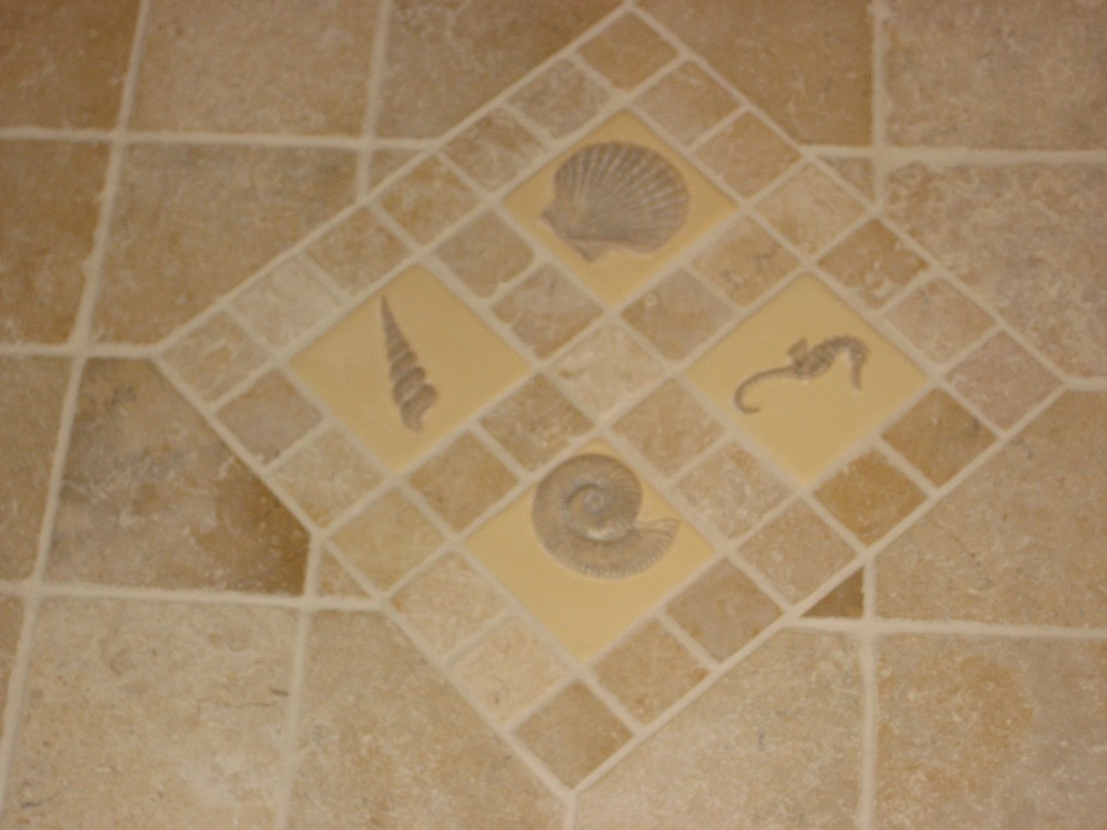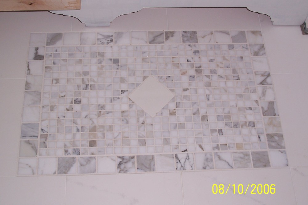 A unique marbe tile floor mat inset beneath the vanity - a permanant throw rug!
