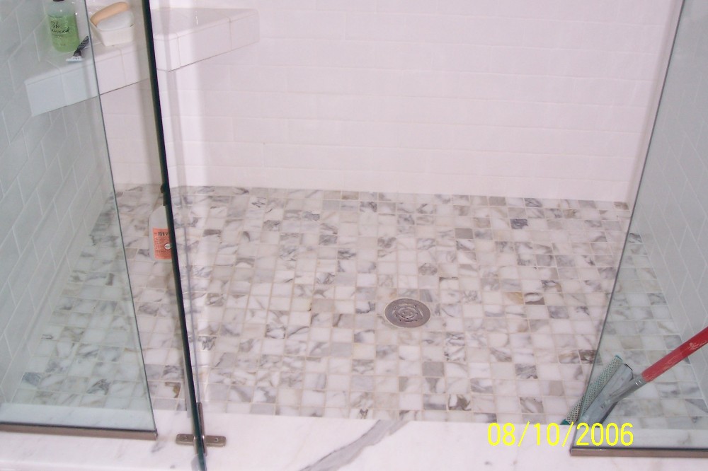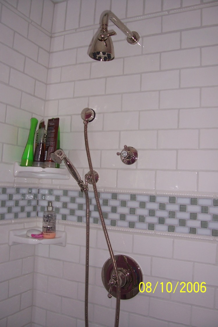 The sea glass checkered border really livens up an otherwise simple subway tiled shower, coupled with the 2 x 2 marble floor tiles it provides a luxurious look