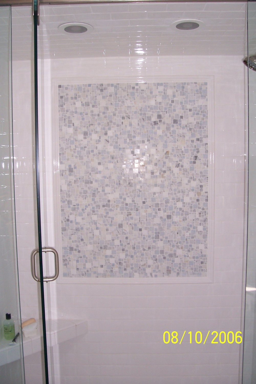 Cool mosaic marble inset at the back shower wall creating a truly magnificent look