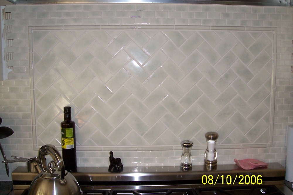 Crackled sea green subway tile in a herringbone pattern with a border behind the stove