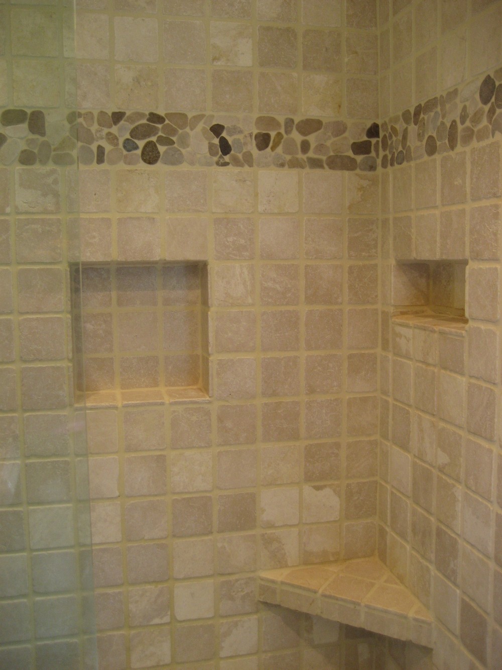 River rock border accompanies tumbled marble shower with two inset shelves and a corner seat